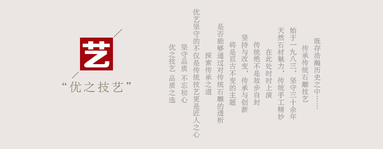 公司在傳統雕刻藝術的基礎上,承前啟后,推陳出新,采眾家之長,集傳統手藝之精華,在傳統大理石雕塑 、經典銅雕塑 、現代不銹鋼雕塑及仿真玻璃鋼雕塑等領域堅持“傳承經典,開拓創新”的制作理念,不斷融合,持續發展,獲得眾多客戶的一致好評。